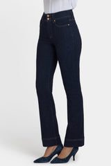 Smoothing and sculpting with flattering flare to boot, NYDJ's Barbara Bootcut Jeans with High Rise fit just right. Our exclusive Lift Tuck® Technology uses a proprietary slimming panel with a patented criss-cross design to flatten in front and boost curves in back. The traditional bootcut fit creates a body-hugging, legs-for-days look. This Barbara Bootcut style features a higher rise than our typical Barbara Bootcut as well as a double-button waistband and trouser-style hems. Finished with classic five-pocket styling and zip fly. Magical is a rich, dark indigo wash with a clean, classic look and copper contrast stitching. This jean is made with earth-friendly methods that result in reduced consumption of water, chemicals and/or energy.
