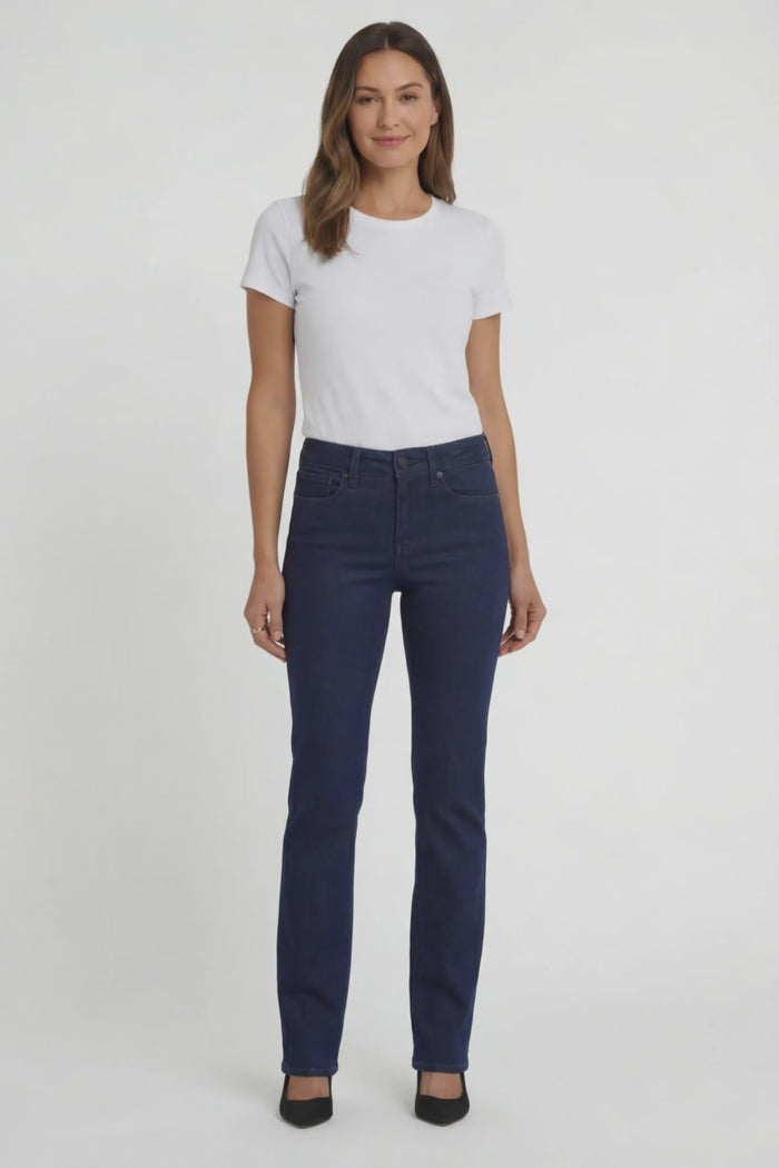 The easy, figure-elongating construction of the NYDJ Marilyn Straight Jeans pairs well with everything, thanks to a flattering waist and a versatile straight-leg fit. Lift Tuck® Technology uses a proprietary slimming panel with a patented criss-cross design to shape and support your curves for an always-sleek silhouette. Finished with classic five-pocket styling, zip fly and button closure.