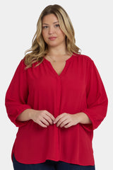 NYDJ's Pintuck Blouse in Plus Size has a billowy three-quarter-sleeved silhouette that's perfect when paired with any of our slimming denim styles. Pleating at the back yoke creates a sophisticated yet easy drape. Finished with a split round neckline, covered full front placket and button closures. This blouse's fabric is made with a sustainable polyester fiber created from 100% post-consumer plastic waste, resulting in less water and energy use and fewer greenhouse gas emissions without changing the look and feel of the fabric. The buttons are made with 50% post-consumer recycled polyester.