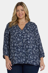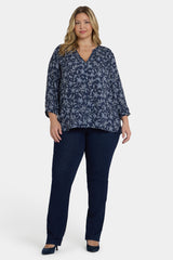 NYDJ's Pintuck Blouse in Plus Size has a billowy three-quarter-sleeved silhouette that's perfect when paired with any of our slimming denim styles. Pleating at the back yoke creates a sophisticated yet easy drape. Finished with a split round neckline, covered full front placket and button closures. This blouse's fabric is made with a sustainable polyester fiber created from 100% post-consumer plastic waste, resulting in less water and energy use and fewer greenhouse gas emissions without changing the look and feel of the fabric. The buttons are made with 50% post-consumer recycled polyester.