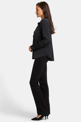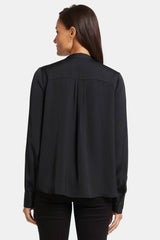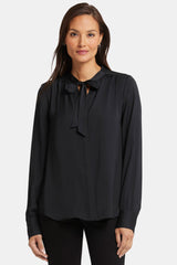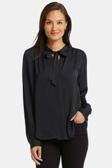 NYDJ's Tie-Neck Blouse makes an elegant statement. With its versatile neck tie that can be styled up or left down and its long blouson sleeves, this blouse exudes sophistication. The glossy satin fabric makes it perfect for both casual and formal occasions. Offering timeless style with a contemporary twist, this blouse effortlessly pairs with your favorite jeans or trousers for a chic and polished look.