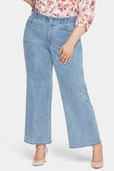 NYDJ's Waist-Match™ Major Wide Leg Jeans in Plus Size with High Rise have a magical satin elastic that lines the interior of the waistband and molds to your waist for an extra-comfortable fit. This style features a slimming high rise and slim fit through the thigh before falling to an exaggerated flare. Our unique Lift Tuck® Technology uses a proprietary slimming panel with a patented criss-cross design for a smoother fit. Finished with a zip and button fly and five-pocket styling with a welt coin pocket.