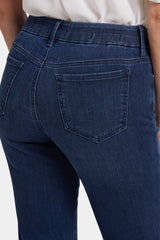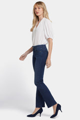 Designed to conform to you, NYDJ's Waist-Match™ Marilyn Straight Jeans have a magical satin elastic that lines the interior of the waistband and molds to your waist for an extra-comfortable fit. The timeless, best-selling silhouette falls straight from knee to hem and pairs well with anything. The design also includes our Lift Tuck® Technology, which uses a proprietary slimming panel to flatten in front and flatter curves in back. Feels like a pull-on jean yet features classic five-pocket styling with a zip fly and button closure. Basin is a dark blue wash with subtle blended whiskers on the front hips, inseam chevrons and hand sanding on the front thighs, knees and seat. This jean is made with earth-friendly methods that result in reduced consumption of water, chemicals and/or energy.